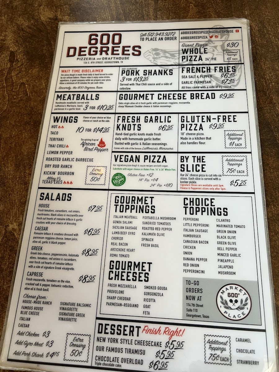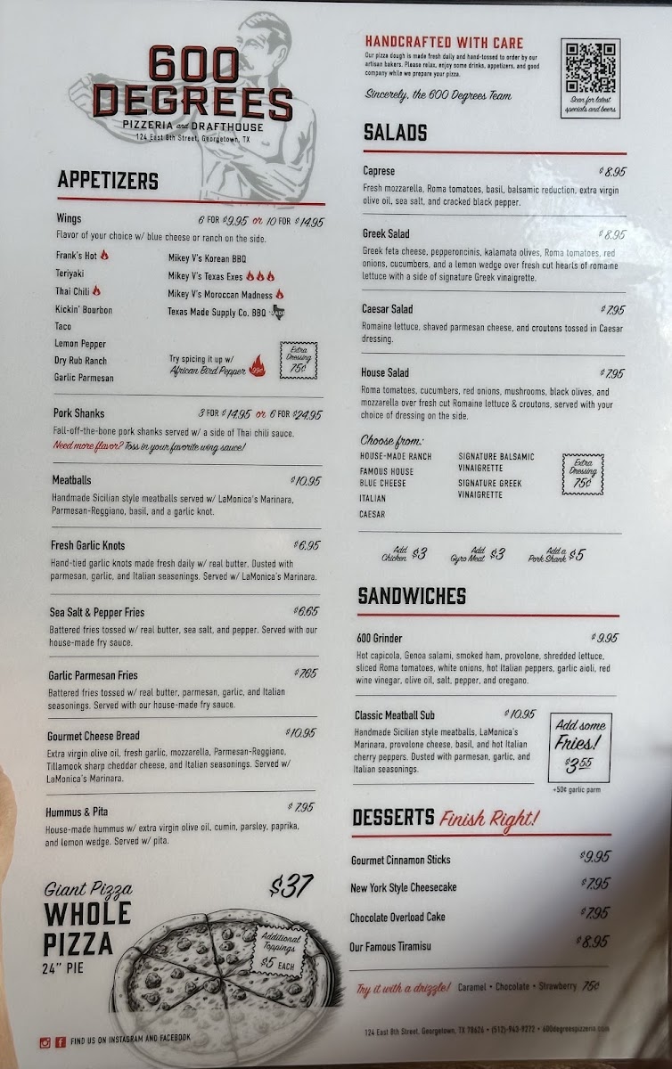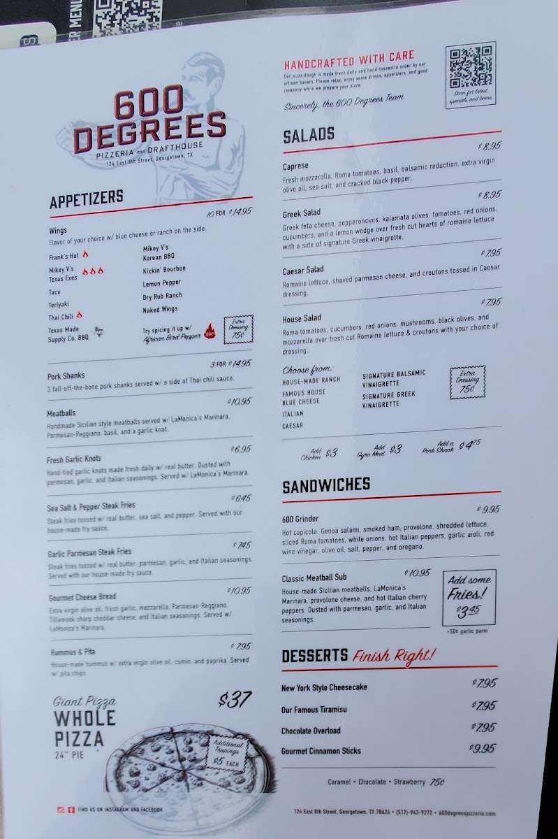 Welcome to 600 Degrees Pizzeria, your go-to destination for amazing pizza in the heart of Georgetown, Texas! Located at 124 E 8th St, this charming pizzeria has quickly become a local favorite, known for its large, delicious slices and welcoming atmosphere.
